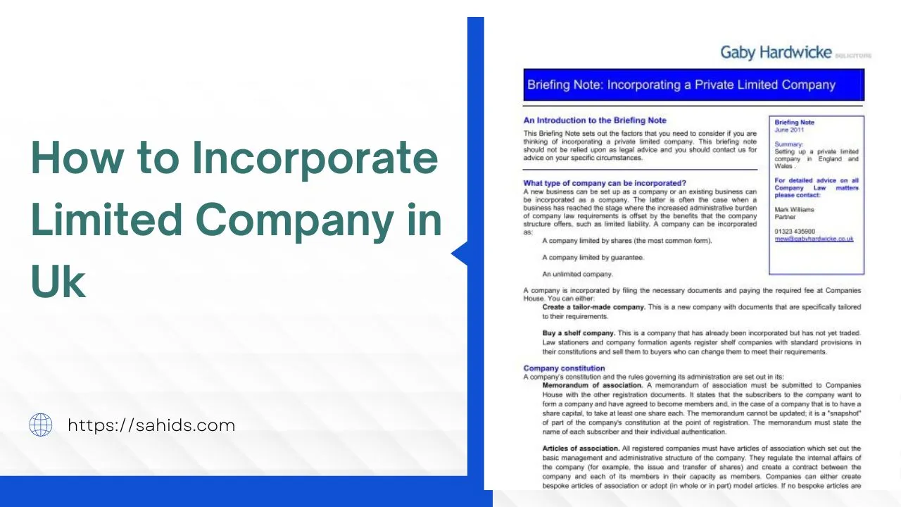 To incorporate a limited company in the UK, register with Companies House online or post a paper application. Select a company name and address, appoint directors and shareholders, and submit the Memorandum and Articles of Association.